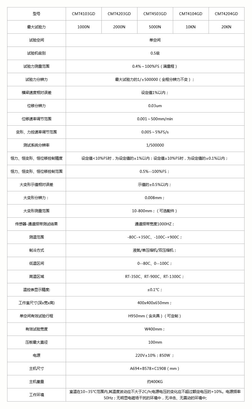 设备主要功能:该高低温拉压力试验机配置CMT系列温控高低温试验箱高温炉高温环境试验装置等,高低温依据Q/UHT-2009《高温高低温拉伸试验标准方法》制造标准,CMT0150试验箱/CMT0350试验箱/CMT600试验箱/CMT900试验箱可选,测试材料在高温高低温等不同环境温度下的各种物理力学试验性能,可满足多种材料的试验测量需要,测控软件可按用户要求扩展功能,高温高低温试验机广泛应用于航空航天、石油化工、机械制造、新型材料、高分子材料、胶粘剂、陶瓷建材、金属材料以及高等院校、科研机构、技术监督、质检站所等部门。