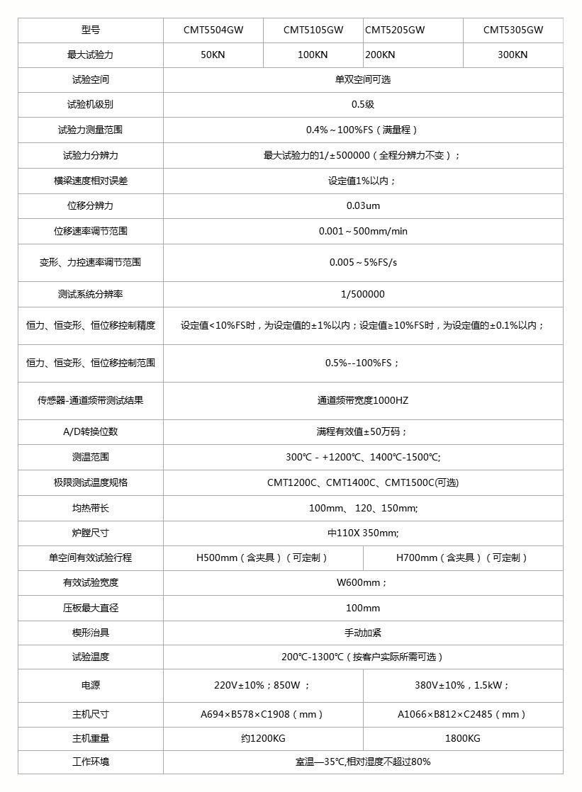 该系列机型具有多种可选的机型结构,如下空间机型、上拉下压双空间机型、上压下拉双空间机型等,可增配环境箱、高温炉做环境试验,设备在1200℃、1400℃、1500℃条件下长期工作稳定,真空密封性能优良;充氩过程平稳;具备超载保护,限位保护,过流、过压、欠气压、超温保护等保护功能;具备欠水压、超温、超压、欠气压等联锁保护功能;