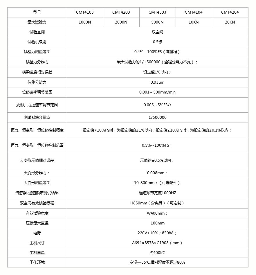 主机采用(单)双空间结构,试验空间为上拉下压(下拉下压),主要由底座和机架构成。底座采用铸铁,机架为门式结构,主要由底板、上中下横梁和连接光杠等组成,横梁采用钢件。采用高强度光杠固定上横梁和工作台面,使之构成高刚性的结构框架。