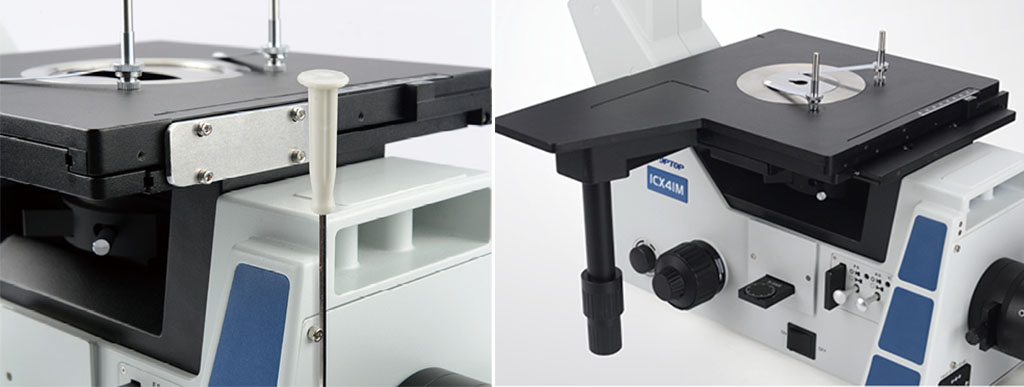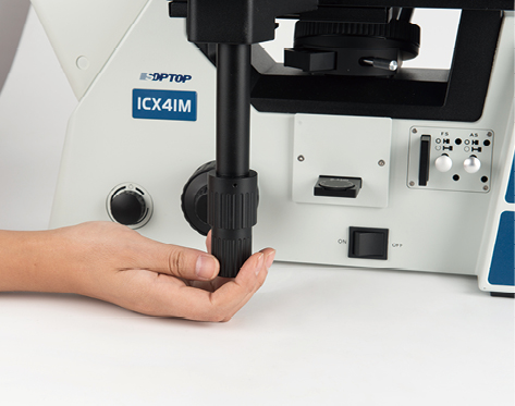 反射明暗场金相机架 , 采用低手位粗微调同轴 , 粗调行程 9mm, 焦面向上 6.5mm, 向下 2.5mm, 微调精度 0.002mm, 带有防止下滑的松紧调节手轮 |