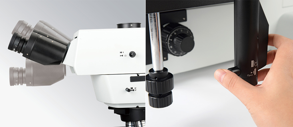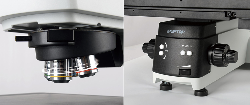 透反机架,前置低手位粗微同轴调焦机构。粗调行程 35mm,微调精度 0.001mm。带有防止下滑的调节松紧装置和随机上限位装置。内置 100-240V 宽电压系统